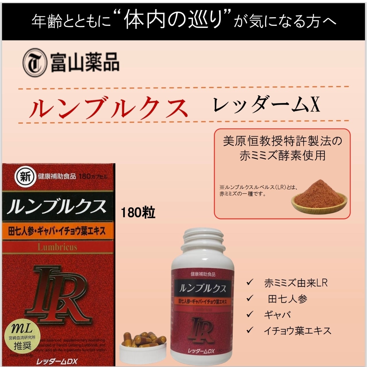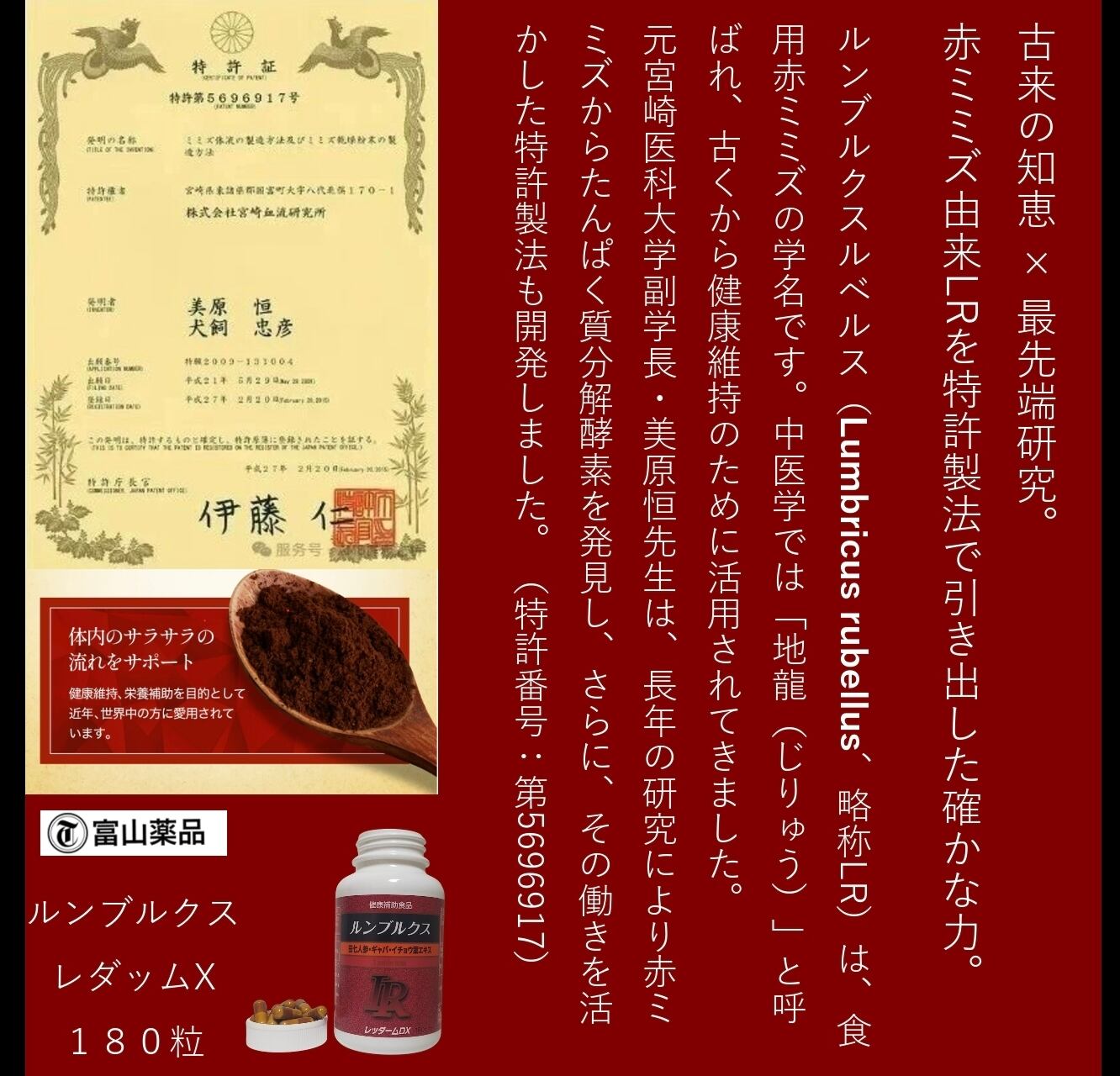 ●ルンブルクスルベルス粉末:美原恒先生(1994年4月~1996年3月宮崎医科大学副学長、宮崎血流研究所創業者)が発見し開発した、新酵素「ルンブルキナーゼ」は、今注目集めています。