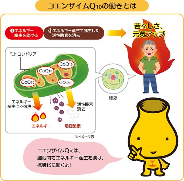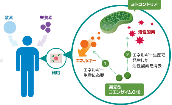 一般的なコエンザイムQ10は、「酸化型」と呼ばれ、、口から摂取の後、体内で還元型に変換の後に吸収されますが、変換する力は加齢によって衰えてしまいます。
