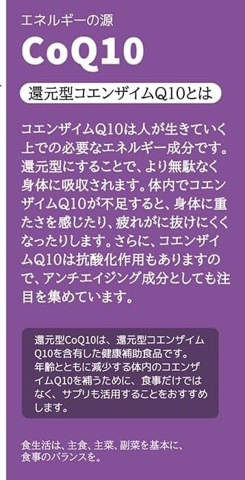 本製品は、「還元型」のコエンザイムQ10を体内にある状態のそのままで配合し、本来の力を効率よく利用できます。